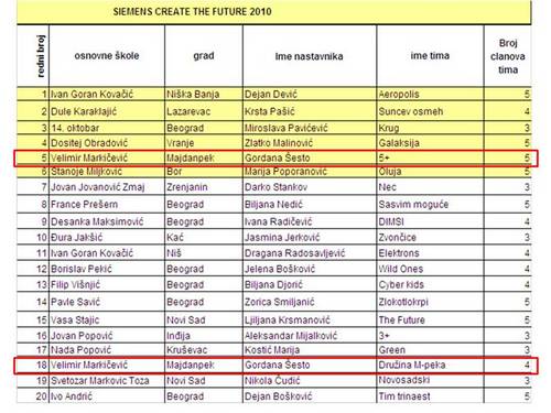 Тема овогодишње такмичења је: „Моја школа – Интелигента зграда“ Компанија Simens d.o.o другу годину за редом организује такмичење у изради мултимедијалних презентација за ученике основних и средњих школа под називом „Create the Future“.Циљ пројекта Create the Future је стицање практичног знања о новим технологијама у школама и развијање особина, као што су тимски дух, креативност и прихватање одговорности. Приликом оцењивања презентација стручни жири ће узети у обзир креативност, графички дизајн и интеграције текста, фотографије, музику и анимације. Ове године на такмичење се пријавило 418 тимова основних и средњих школа широм Србије, а завршене мултимедијалне презентације је предало 116 тимова, и то 61 тим из основних школа и 55 тимова из средњих школа. |